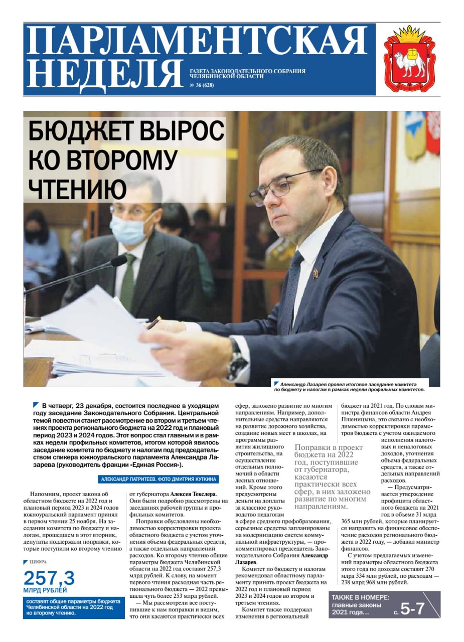 в четверг, 23 декабря, состоится последнее в этом году заседание Законодательного Собрания. Центральной темой повестки станет рассмотрение во втором и третьем чтениях проекта регионального бюджета на 2022 год и плановый период 2023 и 2024 годов. Этот вопрос стал главным на заседании комитета по бюджету и налогам под председательством спикера южноуральского парламента Александра Лазарева;